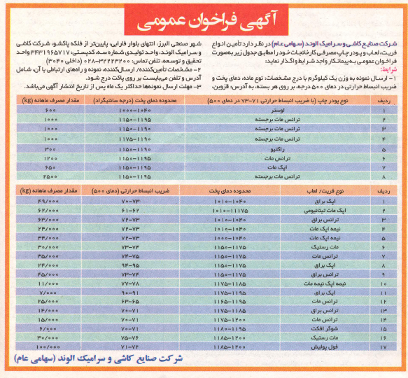 آگهی فراخوان عمومی شرکت صنایع کاشی و سرامیک الوند