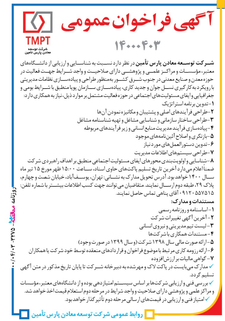 آگهی فراخوان عمومی شماره 14000403 شرکت توسعه معادن پارس تامین