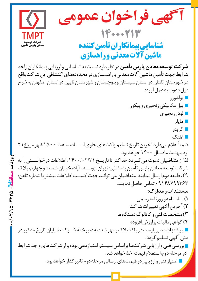 آگهی فراخوان عمومی شناسایی پیمانکاران تامین کننده ماشین آلات معدنی و راهسازی