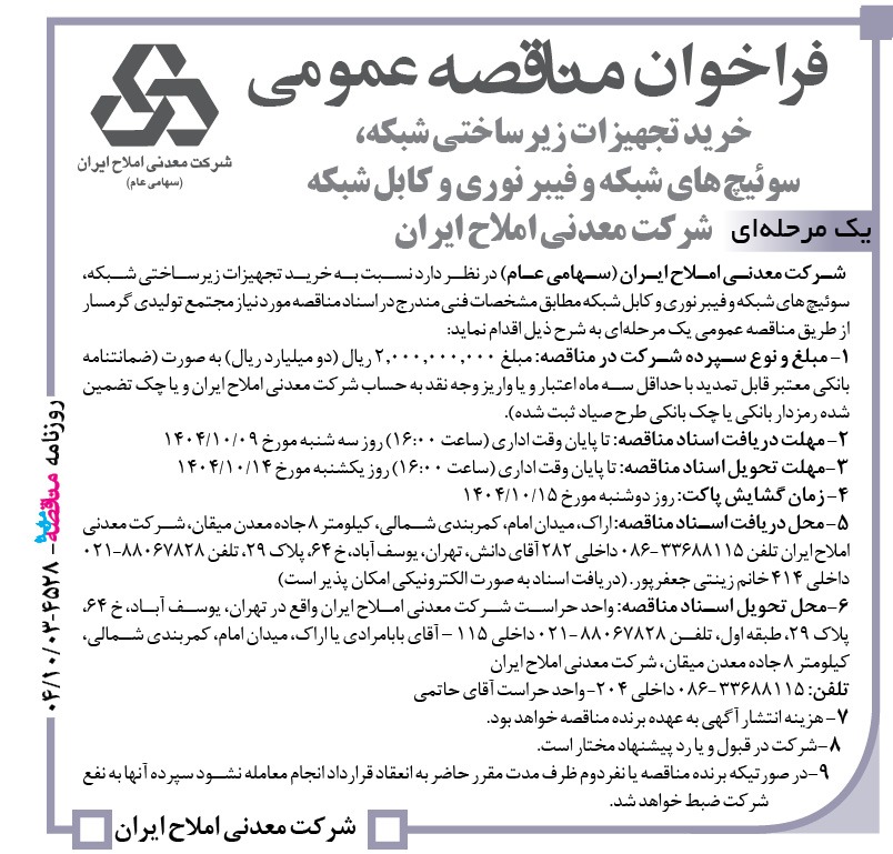 آگهی مناقصه عمومی خرید تجهیزات شبکه،سوئیچ و فیبرنوری در شرکت معدنی املاح ایران