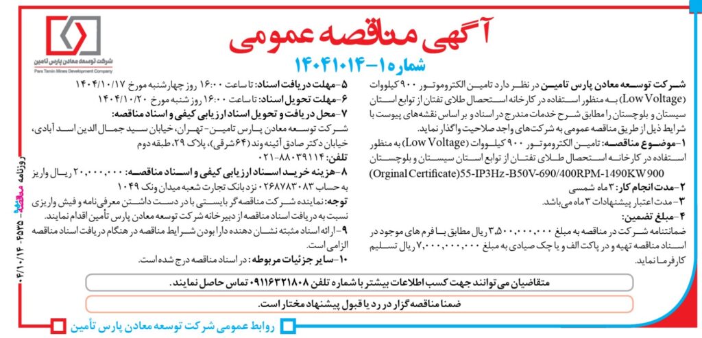 آگهی مناقصه عمومی خرید الکتروموتور برای کارخانه طلای تفتان در شرکت توسعه معادن پارس تامین