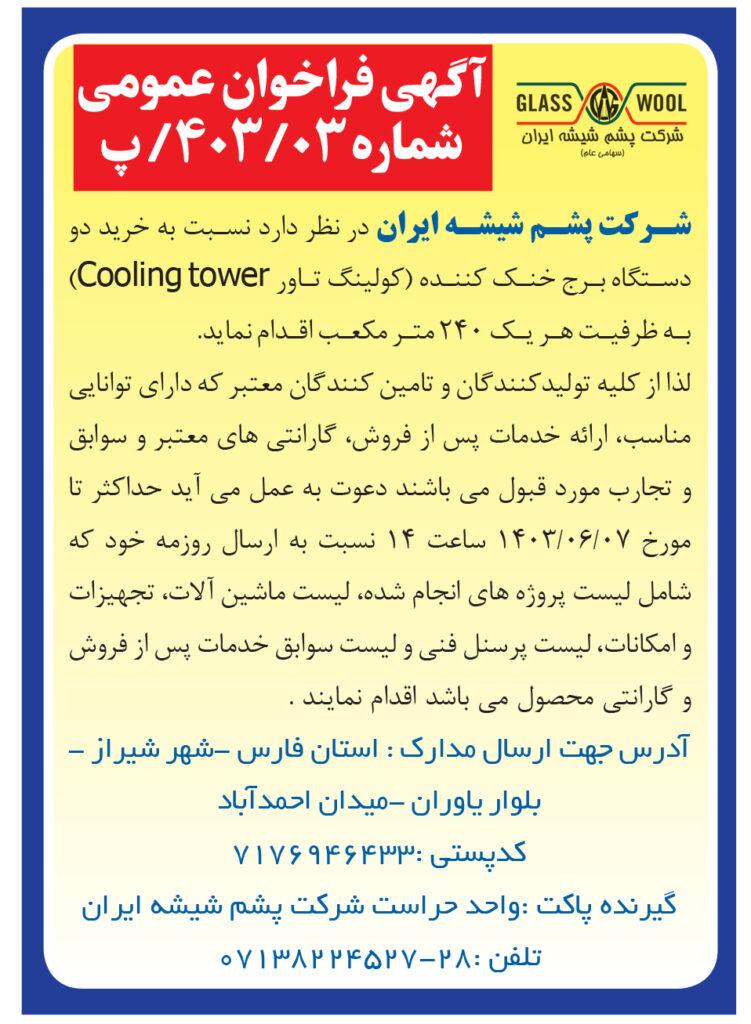 شرکت پشم شیشه ایران در نظر دارد نسبت به خرید دو دستگاه برج خنک کننده (کولینگ تاور Cooling tower) به ظرفیت هر یک ۲۴۰ متر مکعب اقدام نماید.