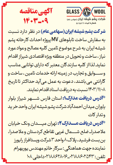 آگهی مناقصه عمومی ۰۹-۱۴۰۳ در شرکت پشم شیشه ایران (سهامی عام)
