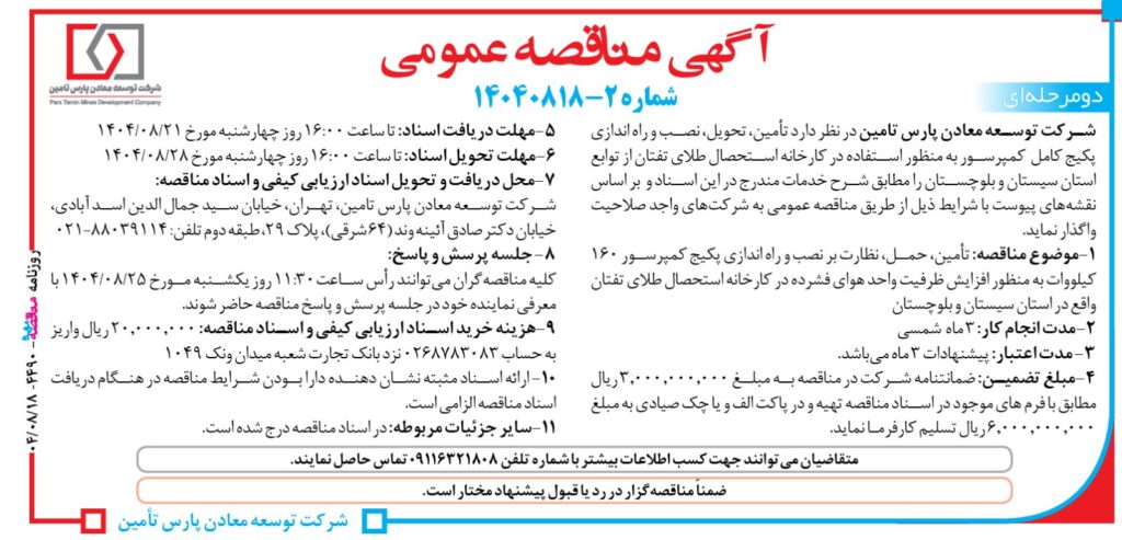 آگهی مناقصه کمپرسور طلای تفتان در شرکت توسعه معادن پارس تامین
