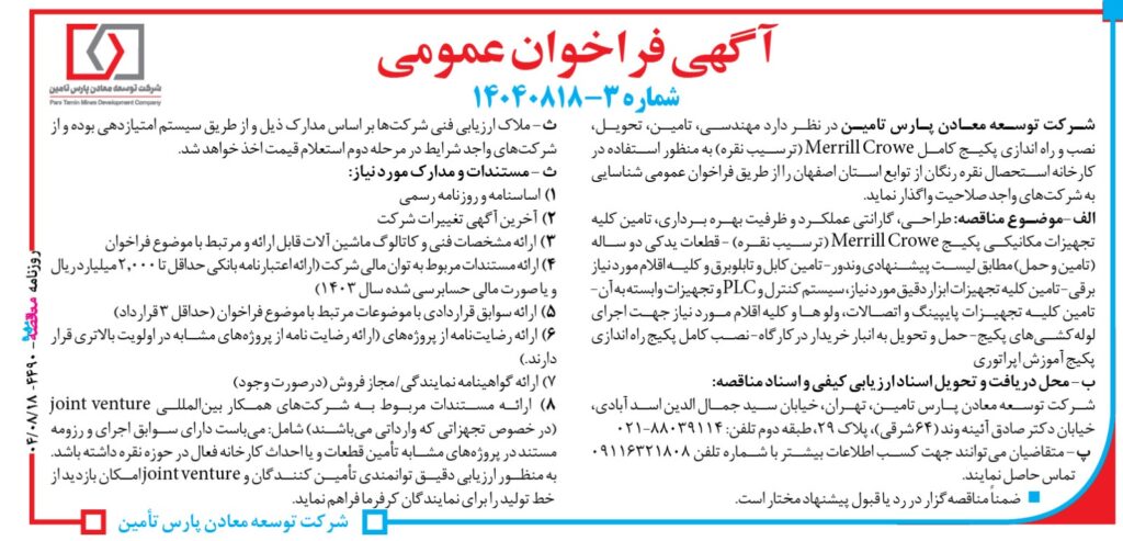 آگهی مناقصه نصب و راه اندازی پکیچ کامل Merrill Crowe در شرکت توسعه معادن پارس تامین